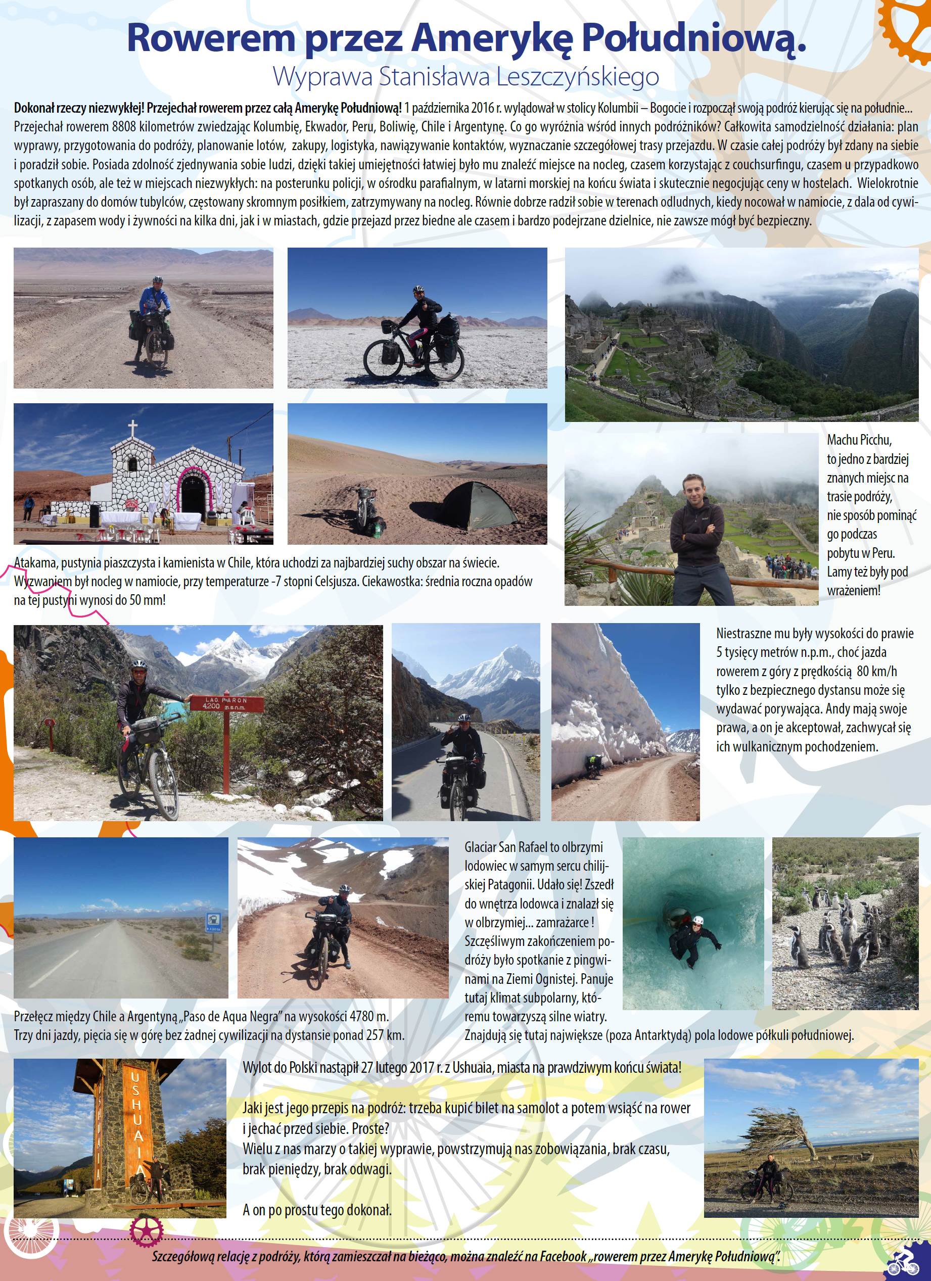 Podczas tych wyjątkowych spotkań Stanisław Leszczyński opowiedział o wyprawie do Ameryki Południowej. W ciągu 5 miesięcy przejechał rowerem ponad 8800 kilometrów zwiedzając Kolumbię, Ekwador, Peru, Boliwię, Chile i Argentynę. Na wystawach podróżnikowi towarzyszyli pasjonaci jednośladów z naszego Oddziału - Katarzyna Boczkowska-Pidek, Ewa Kowalska, Ewa Mróz, Andrzej Posiła i Marcin Bednarczyk.