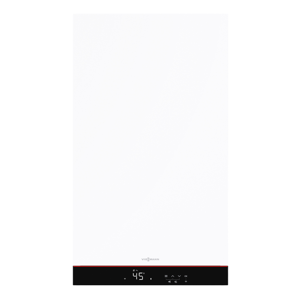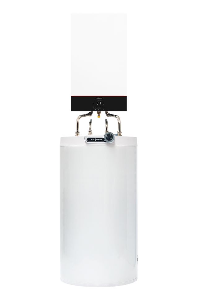 z podgrzewaczem c.w.u.Jednofunkcyjny gazowy kocioł kondensacyjny Viessmann Vitodens 050-W typ B0HA w zestawie z podgrzewaczem c.w.u. EWS 160 o pojemności 144 litrów ze zintegrowaną grzałką ceramiczną.