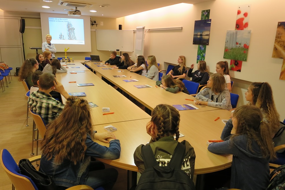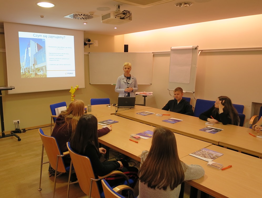 Dorota Mundry, kierownik Działu Komunikacji i PR, opowiedziała o historycznej postaci i dokonaniach naszego patrona - Ignacego Łukasiewicza. Przy prezentacji towarzyszyły nam pomoce naukowe - model głowicy eksploatacyjnej, replika lampy naftowej, rdzenie skał i próbki ropy naftowej.