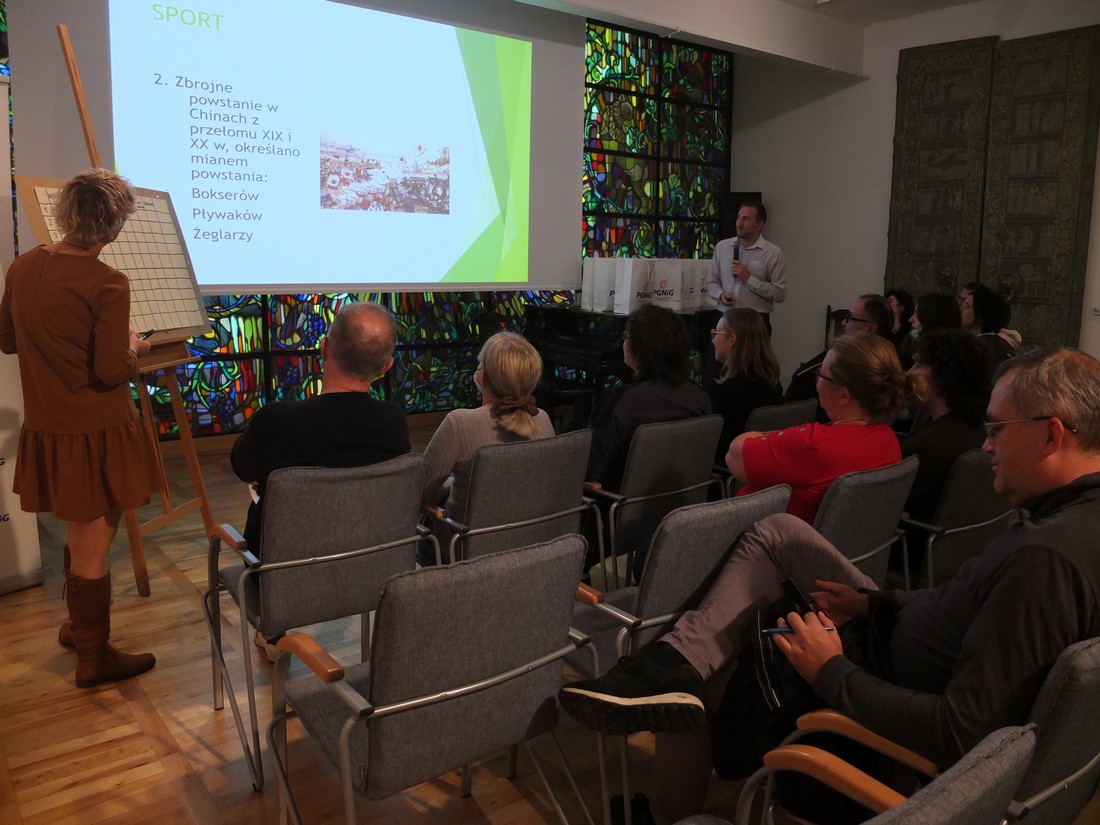 - CEREMONIA PARZENIA HERBATY – przygotowana została przez pochodzącą z Państwa Środka Yuhan Xue (obecnie Sara Szaranek). W trakcie spotkania zaprezentowano trzy rodzaje tego cenionego od tysiącleci napoju: zielona, pu-erh oraz jaśminowa. Pokaz poprzedzony był krótką prezentacją multimedialną, podczas której Pani Sara omówiła historię herbaty oraz najważniejsze informacje związane z jej pochodzeniem i uprawą. Można było również poznać różne smaki tego napoju. Podobnie jak na wykładzie Edwarda Funke Sala Konferencyjna MZL wypełniona była po brzegi.