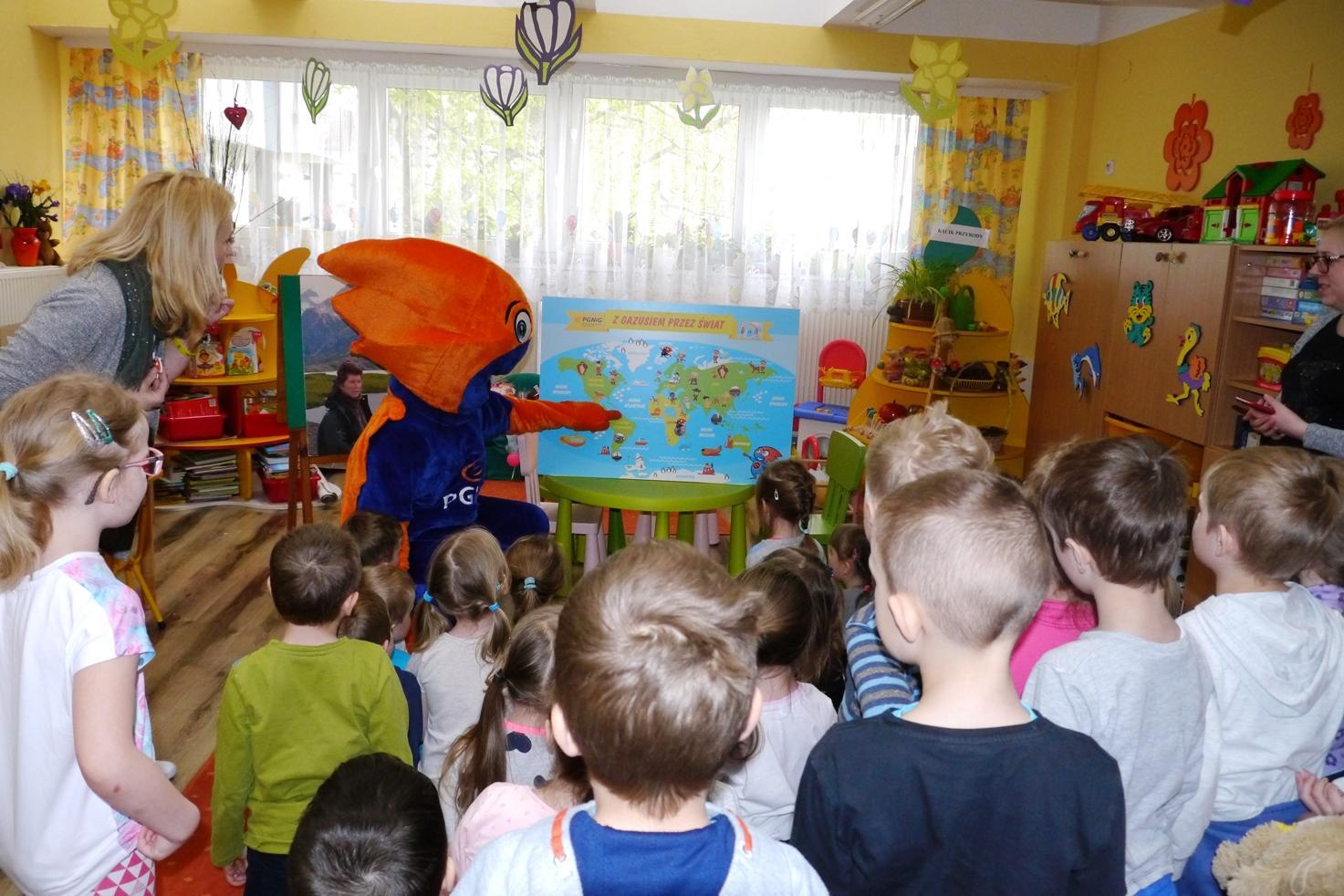 Tym razem firmowa maskotka PGNiG zabrała dzieci z przedszkola nr 34 w podróż do... Ameryki Południowej. Maluchy dowiedziały się gdzie leży ten odległy kontynent, jakie państwa się na nim znajdują oraz poznały zwierzęta licznie występujące w tej dalekiej krainie. Gazuś opowiedział m. in. o jaguarach, flamingach, pingwinach i mrówkojadach. Na koniec dzieci oznaczyły na mapie kolejne miejsce, które udało im się poznać, a w nagrodę za uważne słuchanie otrzymały kolorowanki ze zwierzakami.